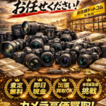 デジタル一眼レフカメラやフィルムカメラ、ビデオカメラ、レンズ、天体望遠鏡など新品・中古品問わず高額買取を実施しております。使わなくなったカメラであれば、お電話一本で見積り・査定額をお伝え致します。どうぞお気軽に買取サービスをご利用ください。